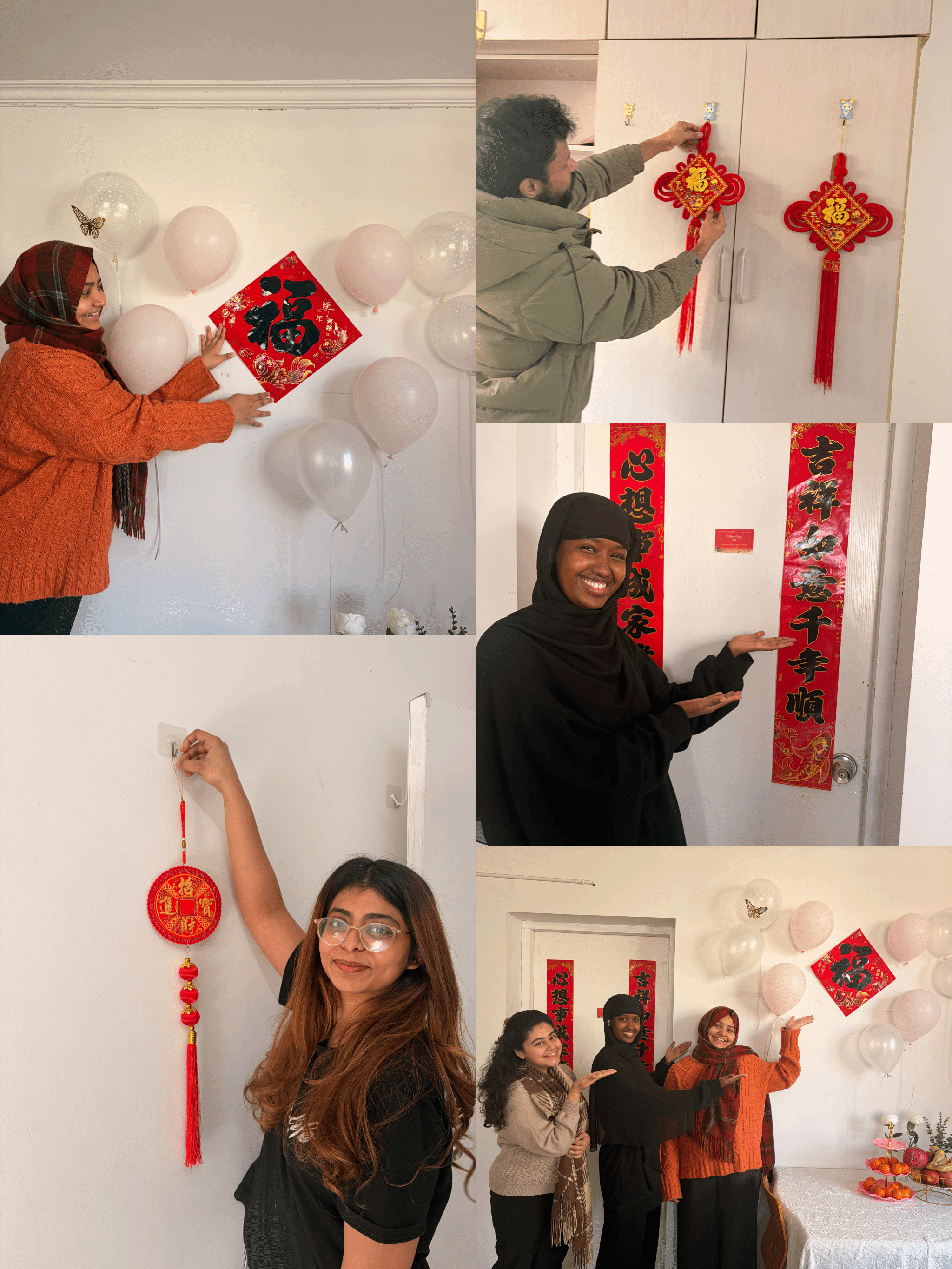 随后,辅导员与留学生们一起动手装点宿舍。大家贴春联、挂灯笼,将寓意吉祥的中国结和福字精心布置,宿舍内顿时洋溢着浓浓的年味。 一边贴春联,一边为留学生讲解春联的寓意和中国春节的传统习俗。“上联“吉祥如意千年顺”,下联“心想事成家业兴”,寄托着人们对新年的美好期盼。”留学生们听得津津有味,纷纷动手尝试,现场气氛热烈融洽。来自巴基斯坦的留学生伊莎开心地说:“虽然不能回家,但和老师同学们一起过春节,体验到了浓浓的中国年味,感觉特别有意义!”