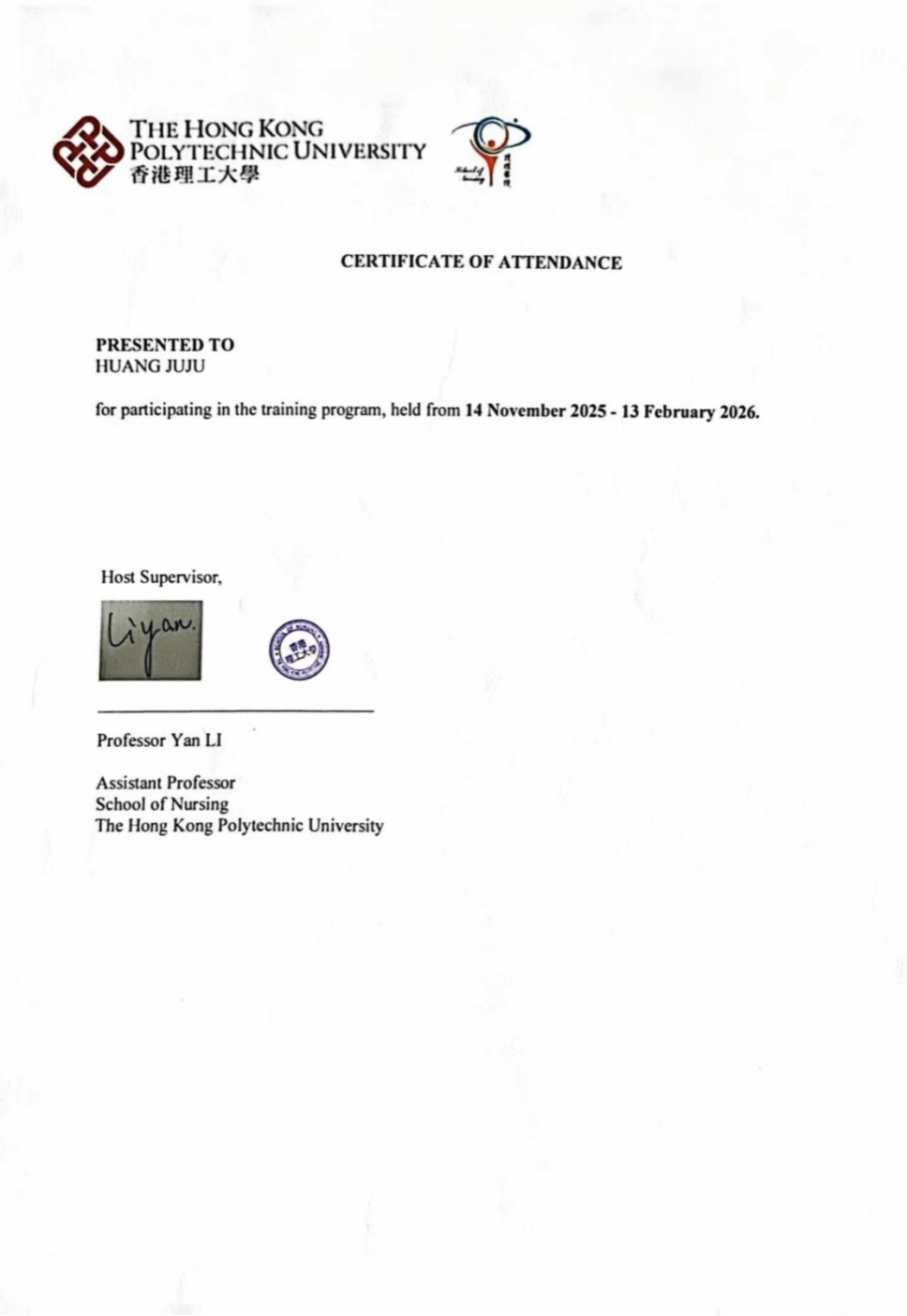 插图3: 香港理工大学颁发的访学证书